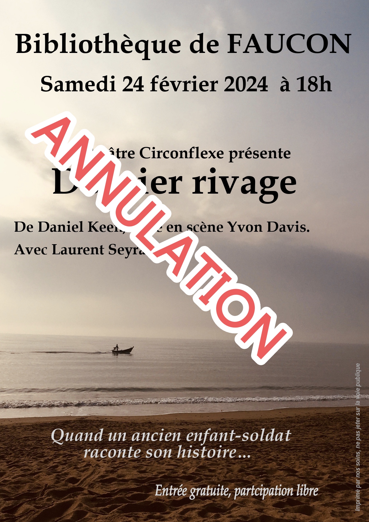 BIBLIOTHEQUE DE FAUCON SAMEDI 24 FEVRIER A 18 HEURES Après PARIS, Laurent Seyral présente la pièce DERNIER RIVAGE (45 minutes) à FAUCON Représentation unique et exceptionnelle suivie d’un apéritif gourmand. Entrée gratuite – participation libre. Venez nombreux, vous ne le regretterez pas.